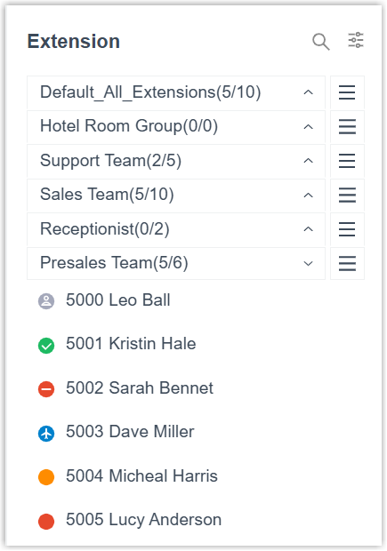 The Extension section displays the extension information and real-time status organized by extension groups or departments, providing you with an at-a-glance overview of user availability.