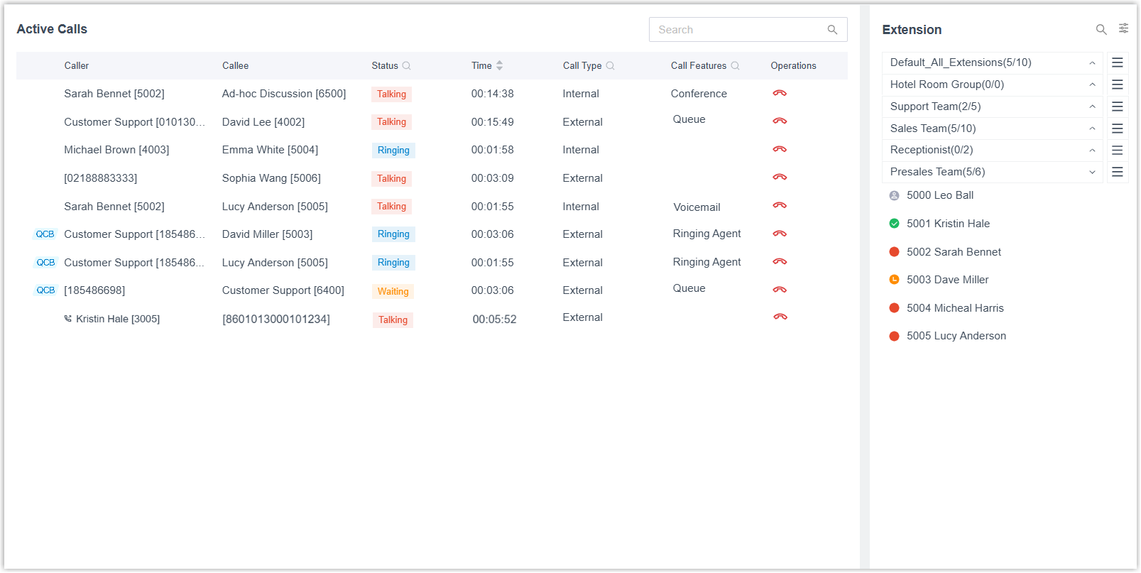Cloud Voice Active Call panel provides a unified view of both live call activities and extension statuses, enabling efficient monitoring and management.