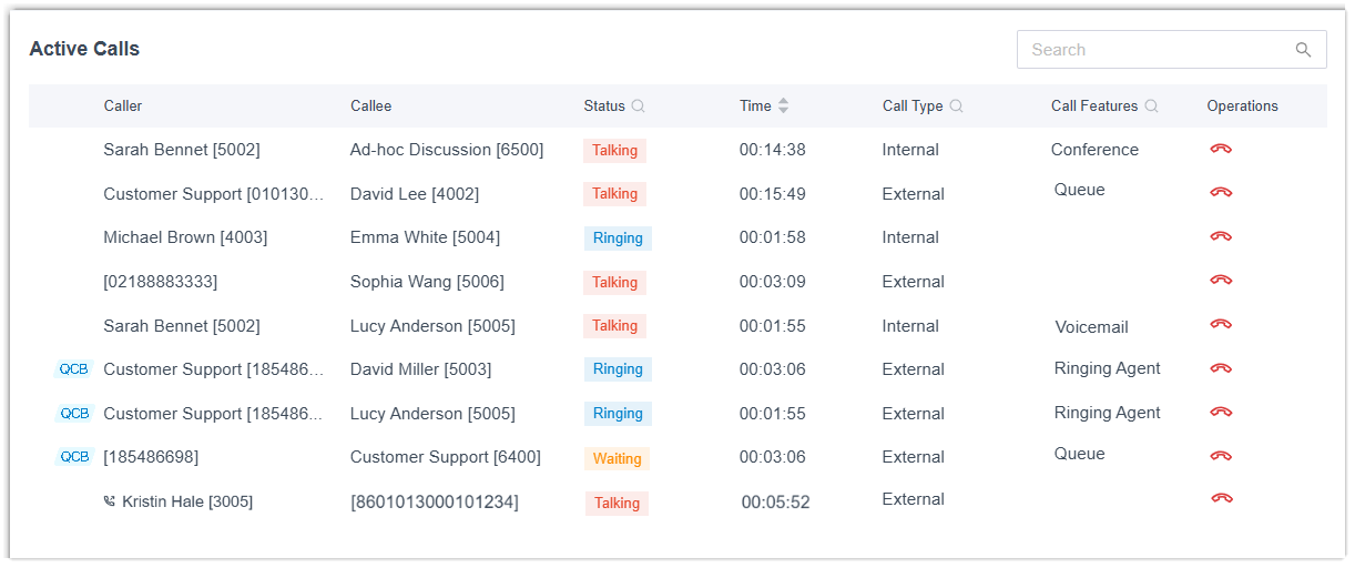 The Active Calls section displays all live calls in the system in real-time and supports the following operations.