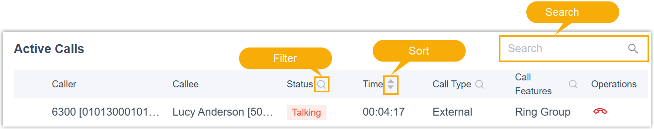 - Search: Enter a number or name in the search box at the top of the active call list to find matching calls by caller or callee information.