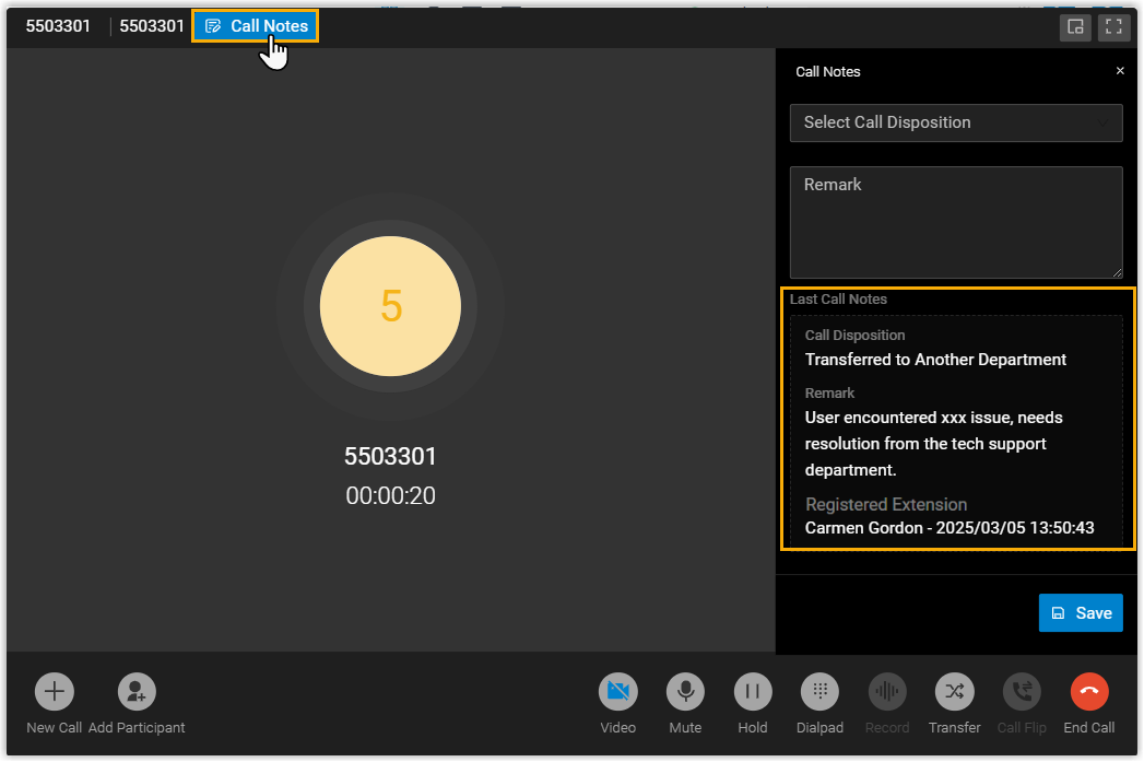 Settings Description Calls from Queue If enabled, queue agents can access the call note feature to add tags and remarks during queue calls or in the wrap-up time, and review or edit the call notes later in the corresponding call logs. Calls from Ring Group If enabled, ring group members can access the call note feature to add tags and remarks during ring group calls, and review or edit the call notes later in the corresponding call logs. Calls to Voicemail If enabled, extension users can access the call note feature to add tags and remarks to the calls that were sent to their extension's voicemails in the corresponding call log. Note: For calls sent to group voicemails, only administrators can add and edit call notes for the corresponding calls in the call detail records (CDR).Calls to Extensions If enabled, extension users can access the call note feature to add tags and remarks during the calls they receive, and review or edit the call notes later in the corresponding call logs. Outbound Calls If enabled, extension users can access the call note feature to add tags and remarks during outbound calls they initiate, and review or edit the call notes later in the corresponding call logs. - Click Save.