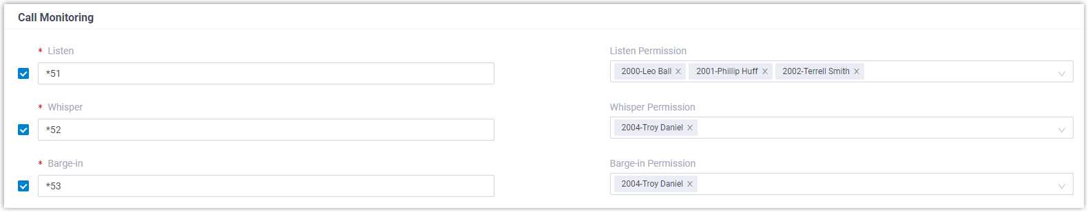 - In the Listen/Whisper/Barge-in Permission drop-down list, select the allowed extensions for each call monitoring mode respectively.