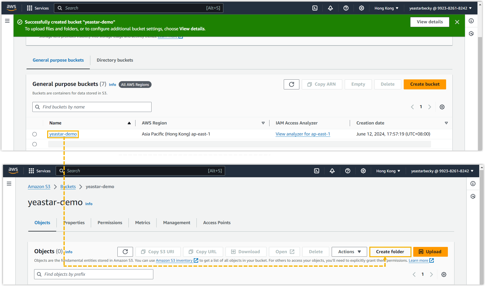 The S3 bucket is created and displayed on the buckets list.Note: If you want to group the archived PBX files in Amazon S3, you can create folders in the bucket. In this way, you can specify PBX files to be archived to the designated folder in the follow-up settings.