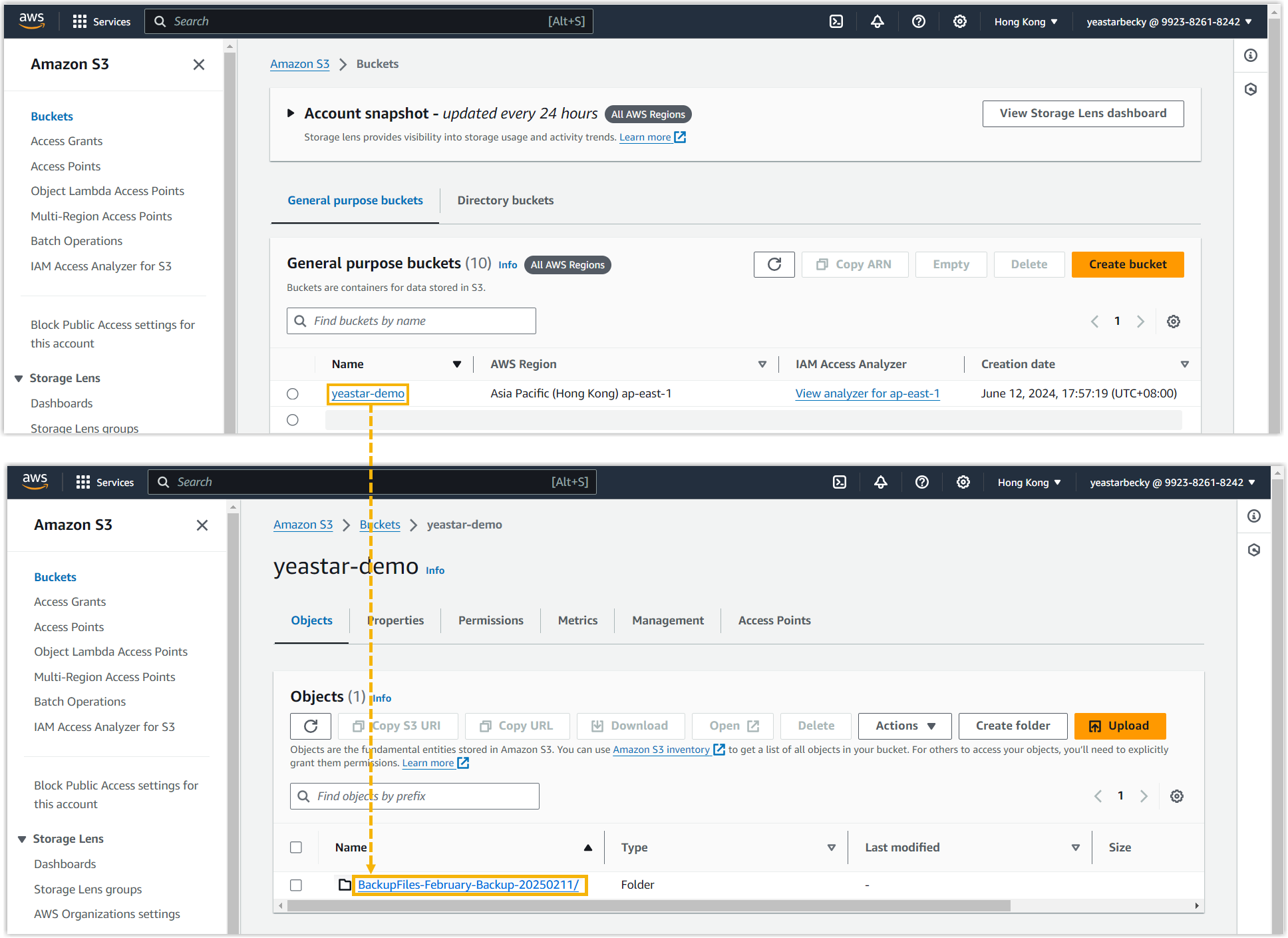 - On AWS Management Console, go to the created S3 bucket. If the specified files appear in the list, it indicates that the archive is successful.
