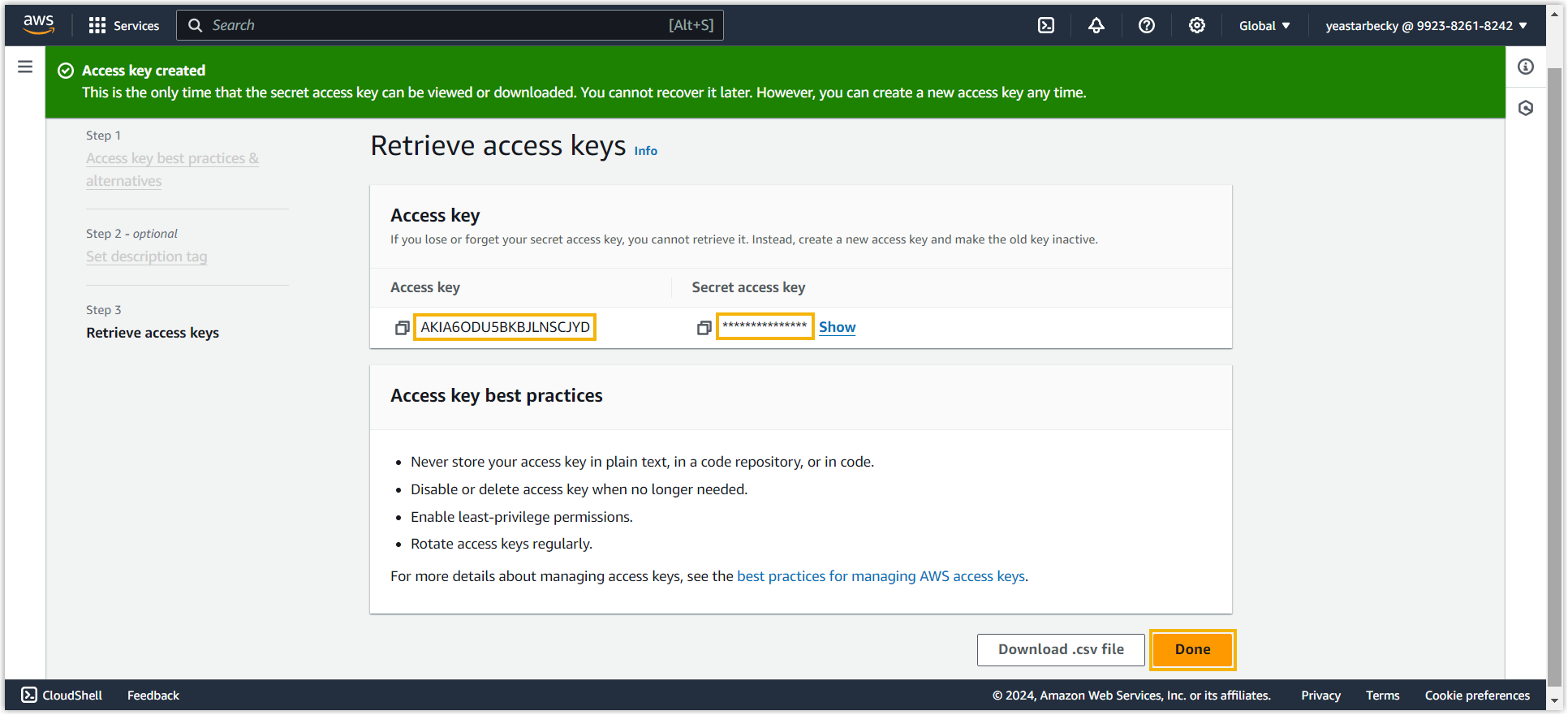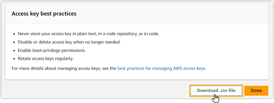then click Done.Important: For Secret access key, the value is shown only ONCE, so make sure that you save the credential in a secure location before clicking Done to close the window. We recommend that you click Download .csv file to save the credential file to your computer.