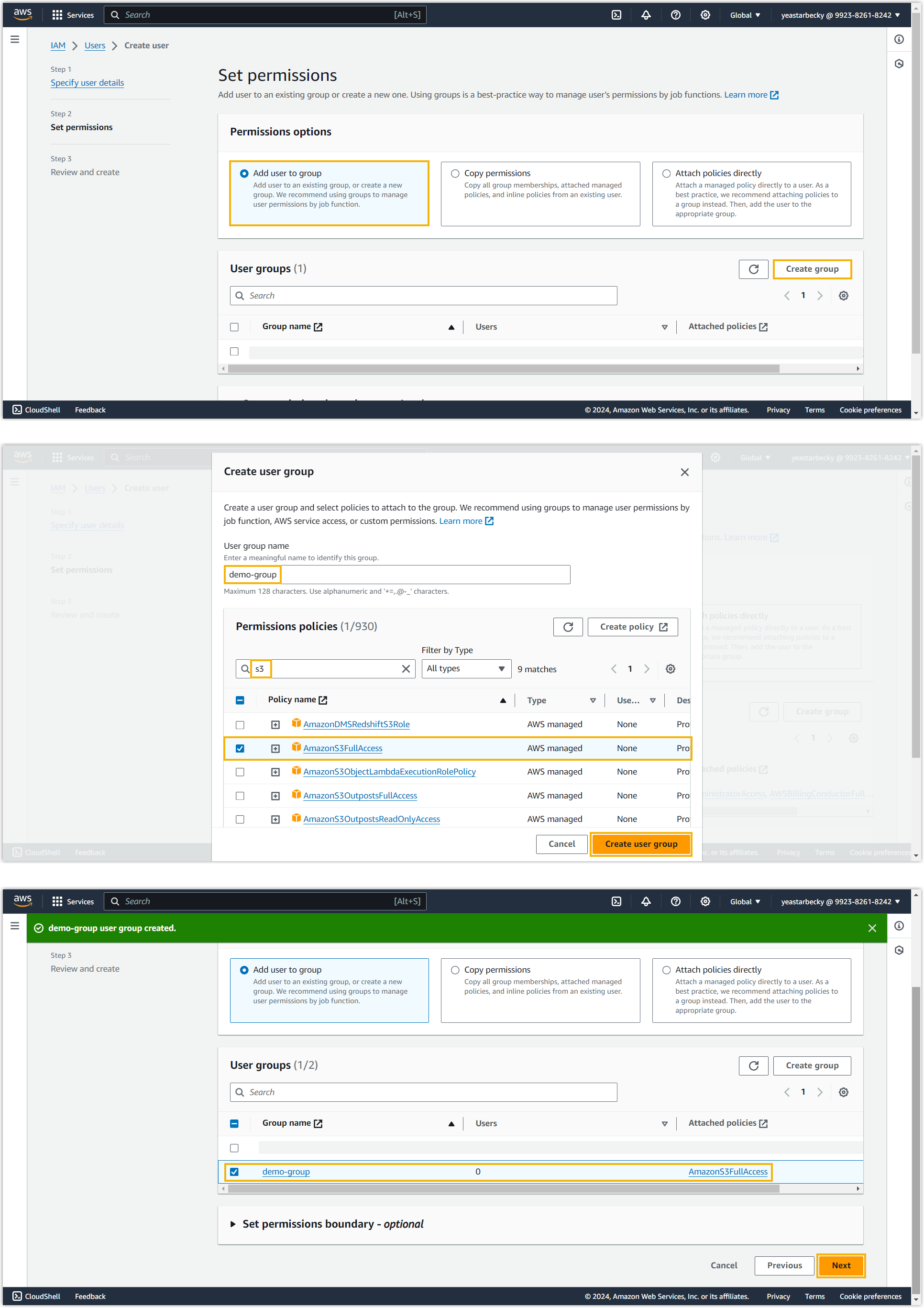 In this example, we create a new group with full Amazon S3 access permission and add the user to the group, as the following figure shows.
