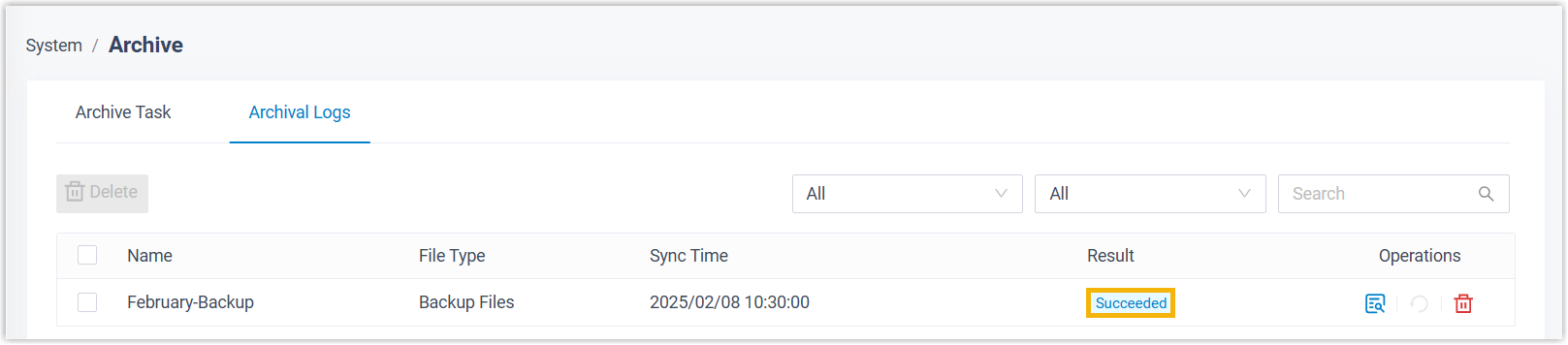 - On PBX web portal, go to . If the Result column of the task shows Succeeded, it indicates that the specified files have been successfully archived to the FTP server.