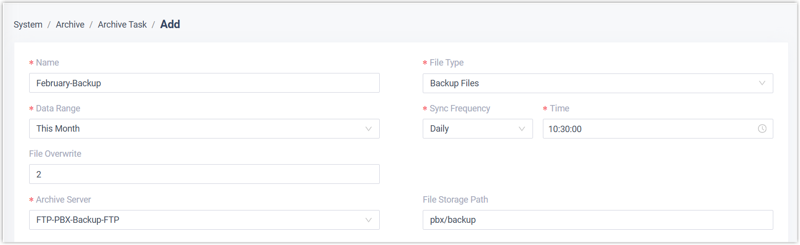 Setting Description Name Enter a name to help you identify the task. File Type Select Recording Files or Backup Files as needed. Data Range Specify a time range of the files to be archived. Note: You can archive files for up to 31 days at a time.Sync Frequency Set how often to archive files to FTP server. Note: As large amounts of data will consume PBX's CPU resources, we recommend that you schedule archive tasks during off-peak hours.- Once: If you choose the option, the system will archive files immediately after you save the task.