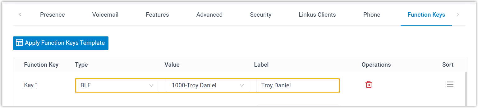 Note: The number of programmable keys varies by phone models. If the number of function keys you assign to an extension exceeds the number of programmable keys, the excess function keys cannot take effect. However, if the user's IP phone is connected with an expansion module, the excess function keys are automatically applied to the expansion module.- In the Name field, enter a name to help you identify the template.