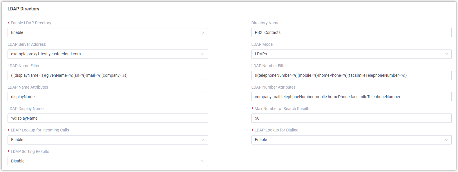 Setting Description Example Enable LDAP Directory Enable or disable the LDAP directory feature. Enable Directory Name Specify a name for the LDAP directory. PBX_Contacts LDAP Server Address Enter the LDAP Server address of Cloud Voice. example.proxy1.test.cloud-voicecloud.com
