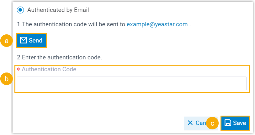 - Click Send.An email containing a 6-digit authentication code is sent to the email address that is associated with the super administrator account.Note: The code expires 5 minutes after the email is sent.