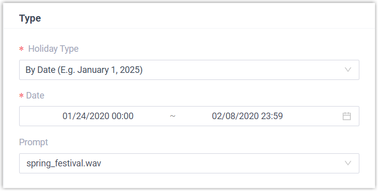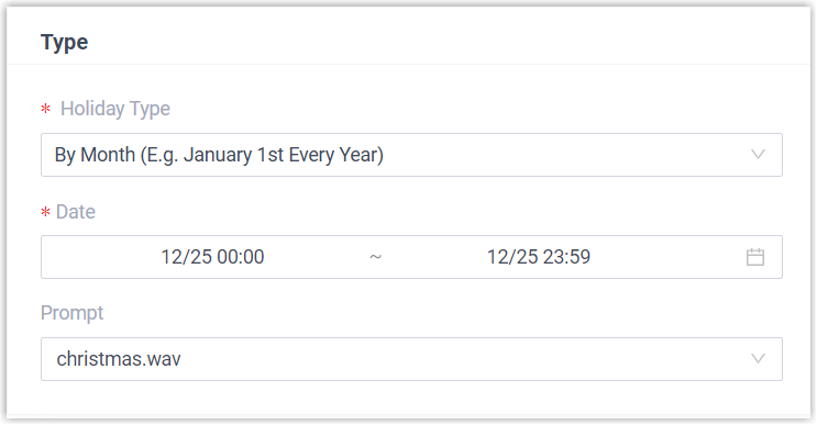 - To play the prompt to callers when they call to the PBX during holidays, you need to enable Play Holiday Prompt During Holidays (Path: ) for the time-based inbound route.