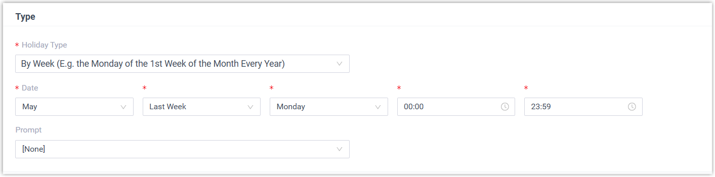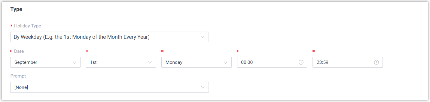 If a holiday always falls on the same weekday, you can set a holiday by weekday (which indicates the specific weekday of the month).