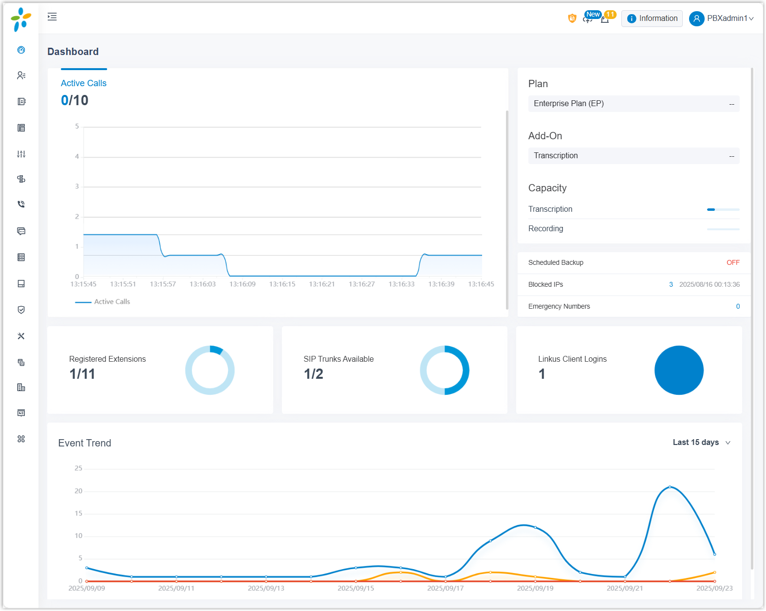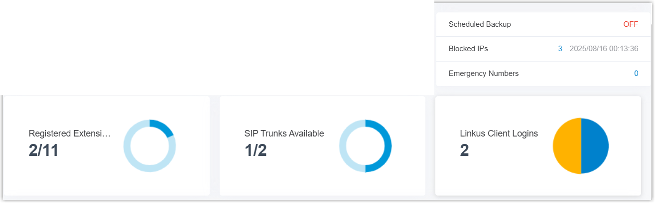 - SIP Trunks Available: The number of available trunks and created trunks.