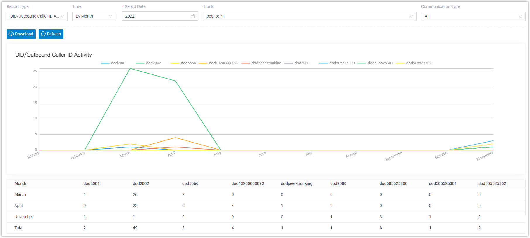The following report shows monthly DID/Outbound Caller ID statistics of the trunk peer-to-41 on 2022.