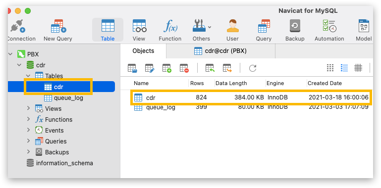 - To check CDR data, double click the new connection, and select cdr table.