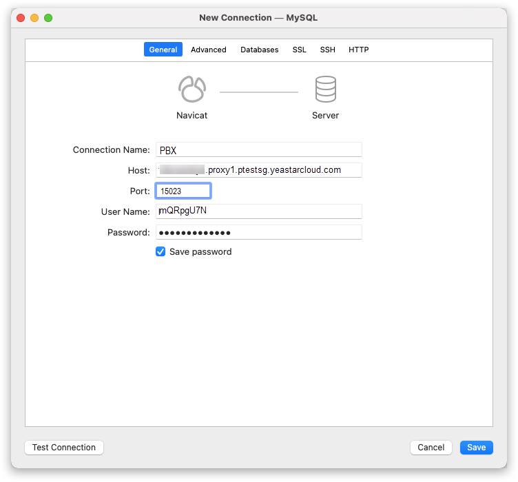 - Host: Enter the database address of PBX