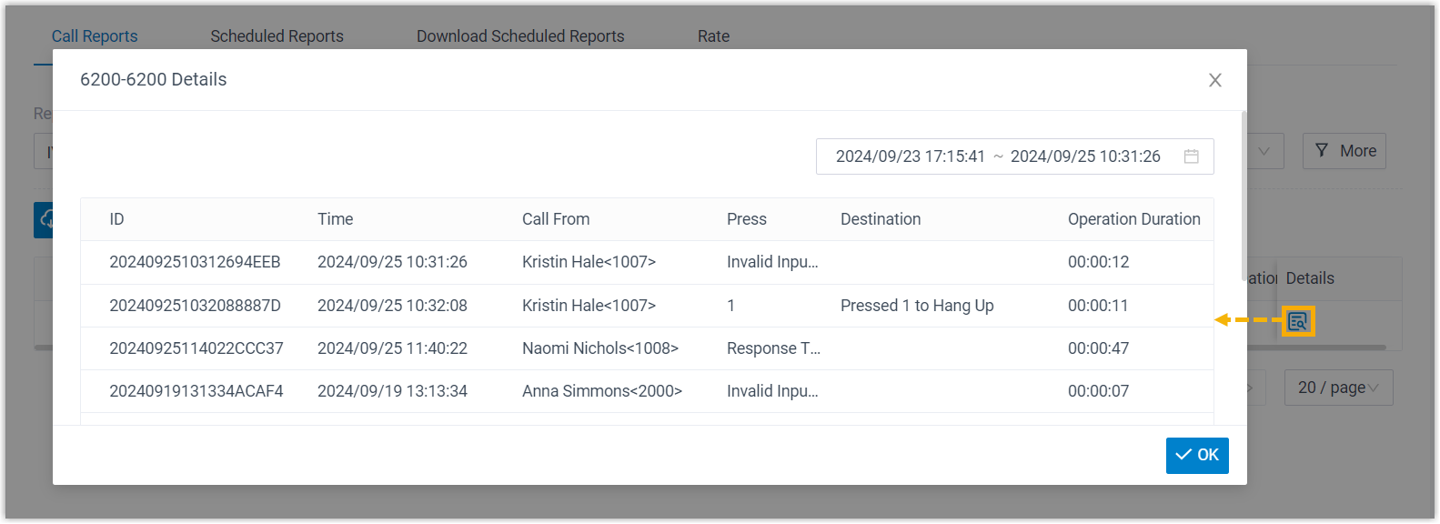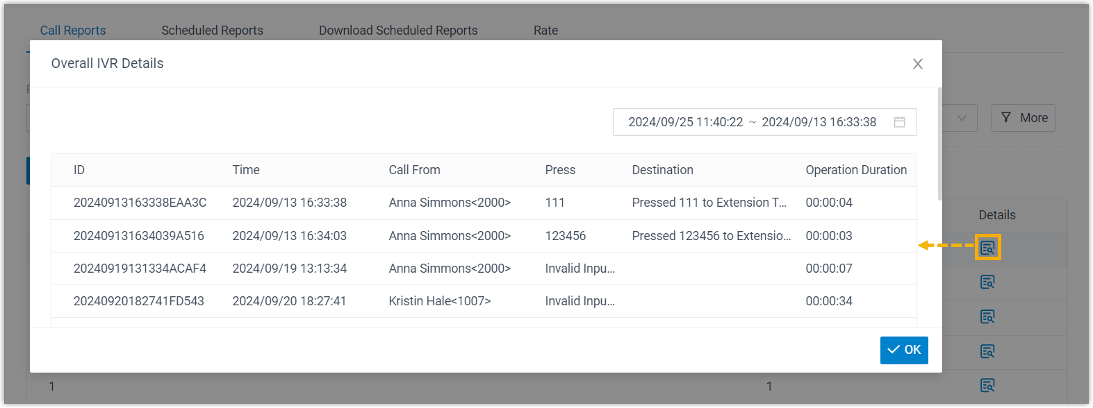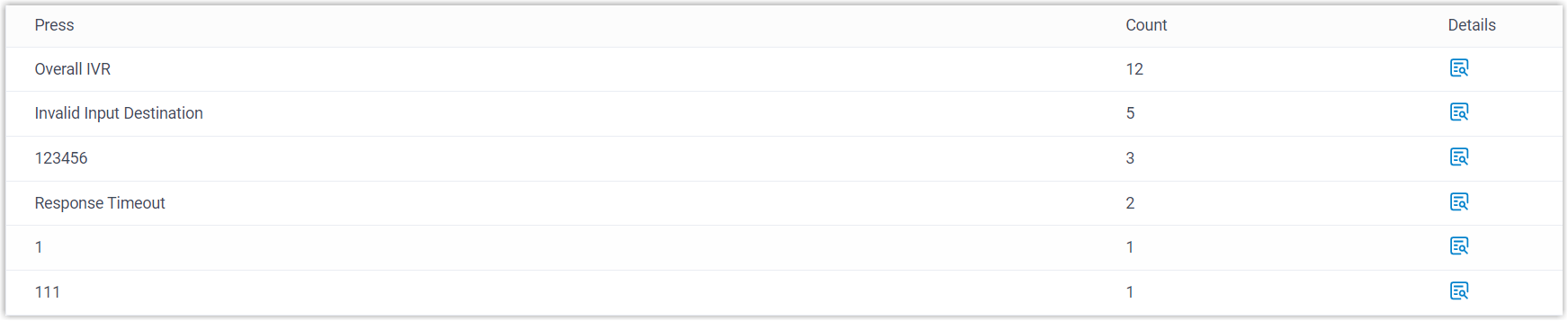 Metric Description ID A unique ID for the call. Time When the call was received. Call From The number and the name of the caller. Press The keypress event. Destination The destination of the call. Operation Duration The time between the caller called into the IVR and exited the IVR.