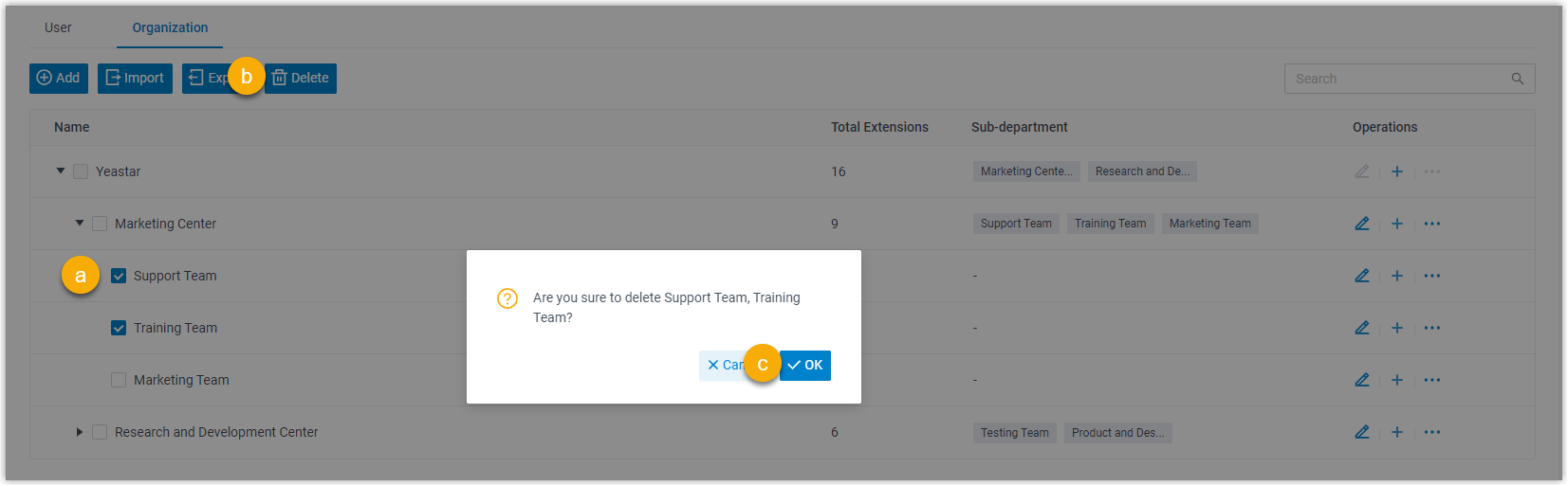 - After you delete departments, the extensions within the departments will not be deleted, but they have no access to the features that are granted to the departments, and they will be grouped into root organization if they only belong to the departments deleted.
