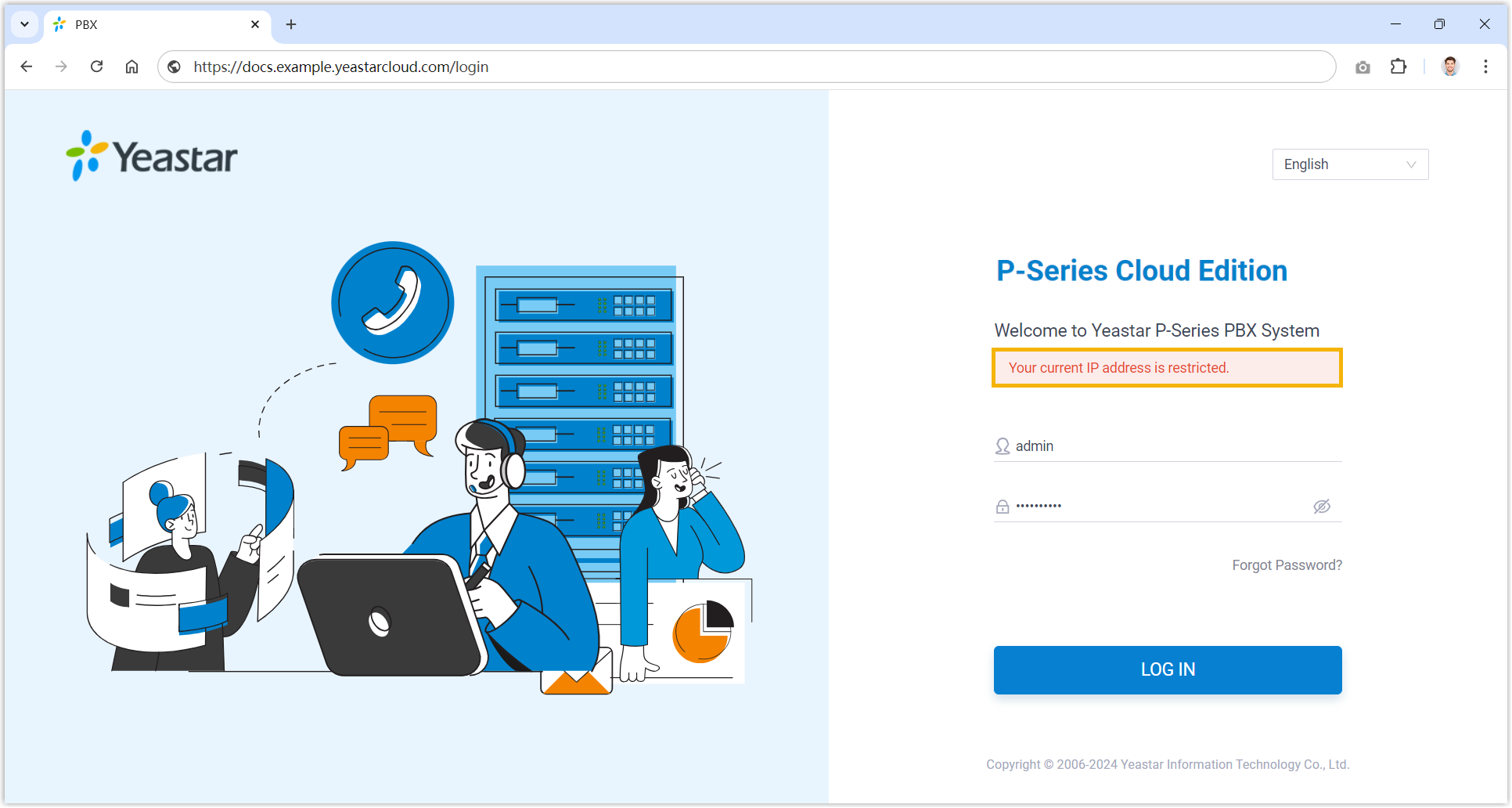 You are prompted that your current IP address is not allowed to log in to administrator portal.