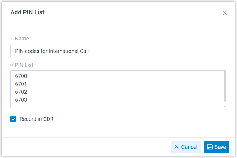 Record in CDR Enable this option. The system will record the PIN code in CDR when the PIN code has been used.