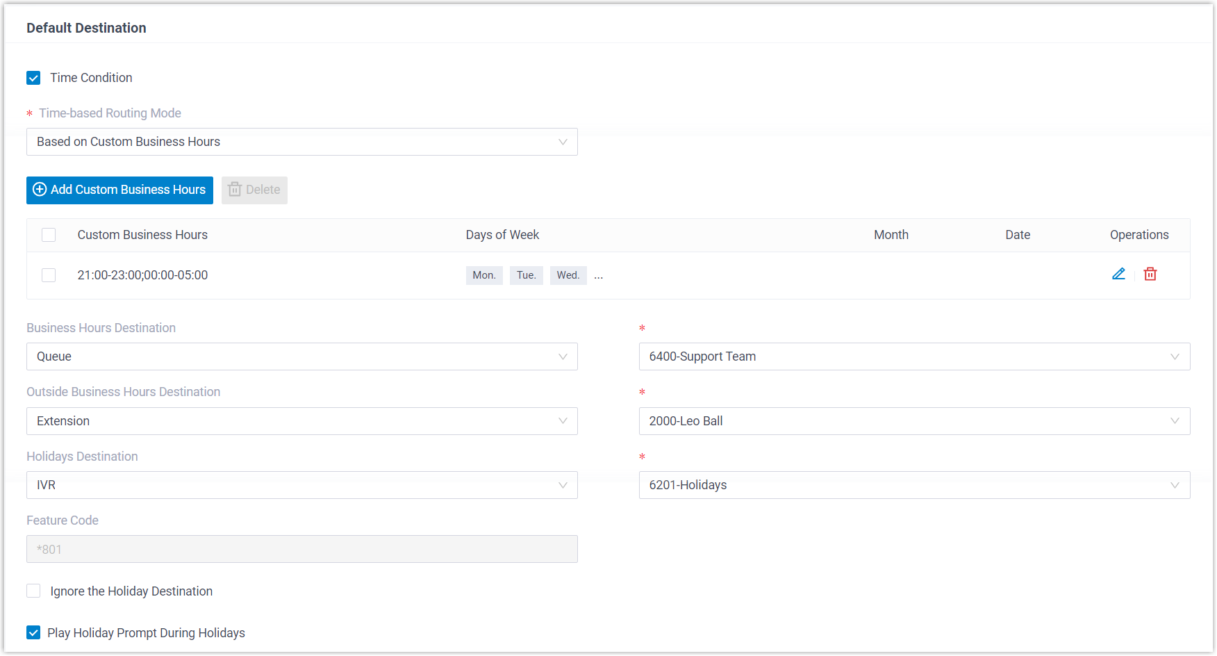- Feature code *801 is generated for the inbound route. The authorized user can dial *801 to override time condition of the inbound route. For more information, see Override Time Condition for Inbound Calls.