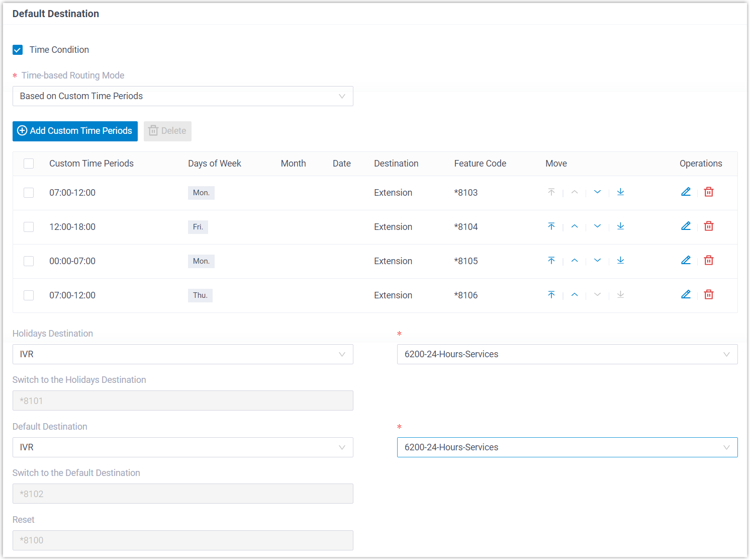 - In the drop-down list of Time-based Routing Mode, select Based on Custom Time Periods.
