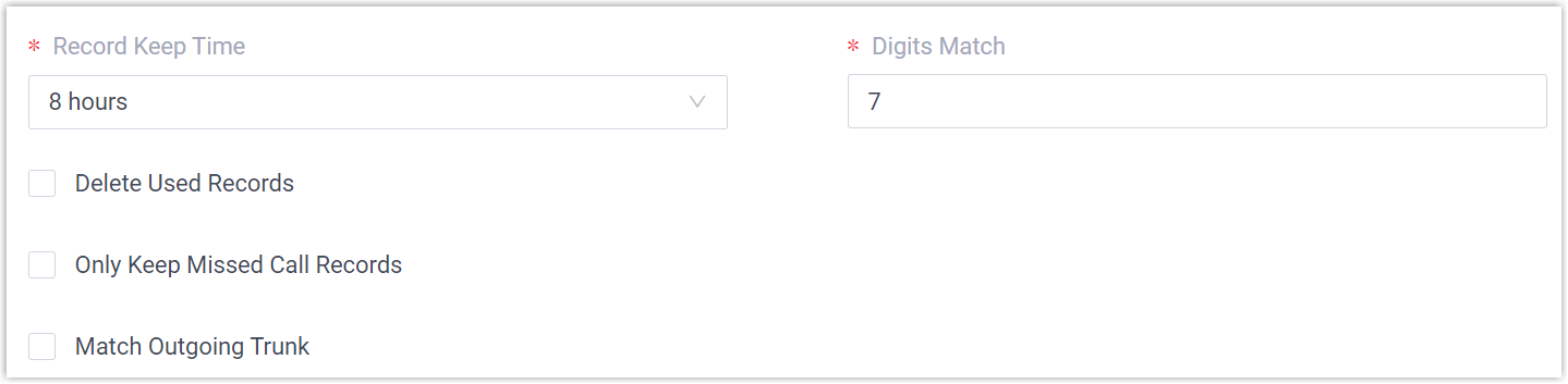 Setting Description Record Keep Time Set how long records can be kept in AutoCLIP list. If keep time of a record exceeds the value, PBX will automatically delete the record. Tip: You can check the expiration time in the AutoCLIP record list directly.Digits Match Define how many digits from the last digit of the incoming Call ID will be used to match the AutoCLIP list. Note: If the number has fewer digits than the value defined here, it will be matched in full length.Delete Used Records If enabled, when an AutoCLIP record is matched, it will be deleted from the record list automatically after the original extension has answered the redirected customer call. Only Keep Missed Call Records If enabled, only when the outbound call is not answered will it be recorded in the AutoCLIP list. Match Outgoing Trunk If enabled, the PBX will route the call to the original extension only when the trunk number dialed by external users matches the trunk that was used to place the call earlier. - In the Trunk section, select which trunks will use