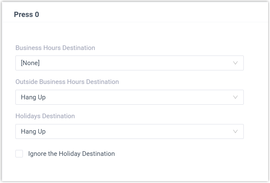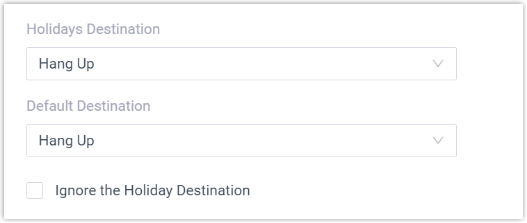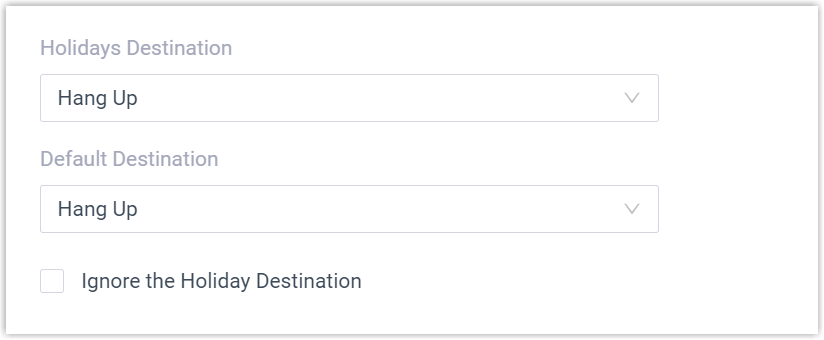- Holidays DestinationNote: If you want to route incoming calls based on custom business hours and non-working hours during holidays, select the checkbox of Ignore the Holiday Destination.