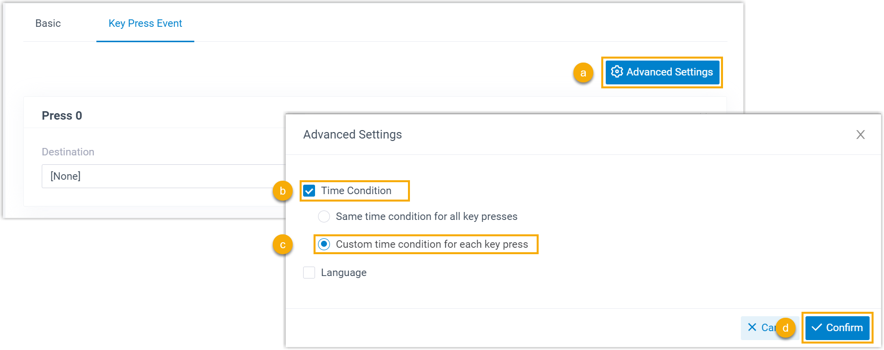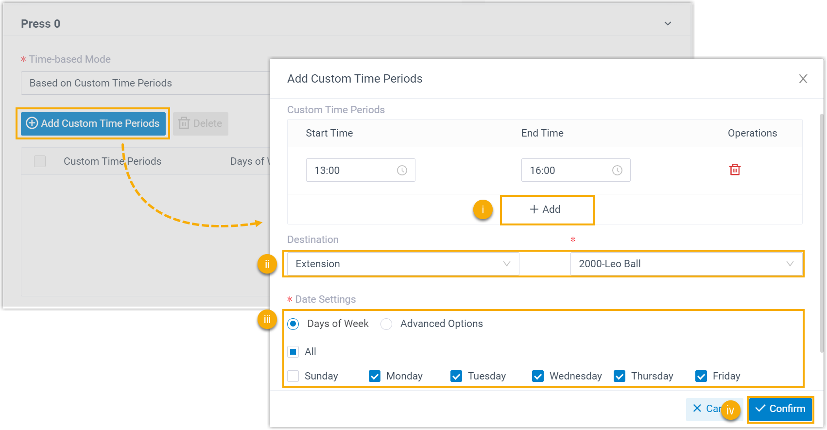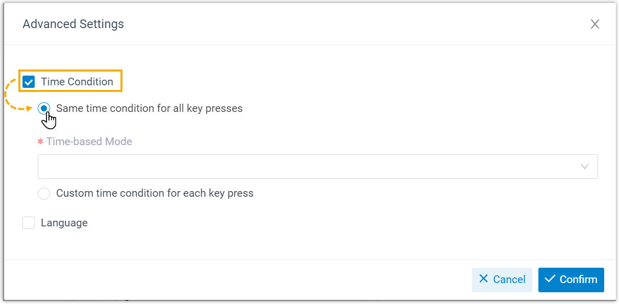 - Click Confirm.Note: The specified custom time periods ONLY take effect for this key press event.