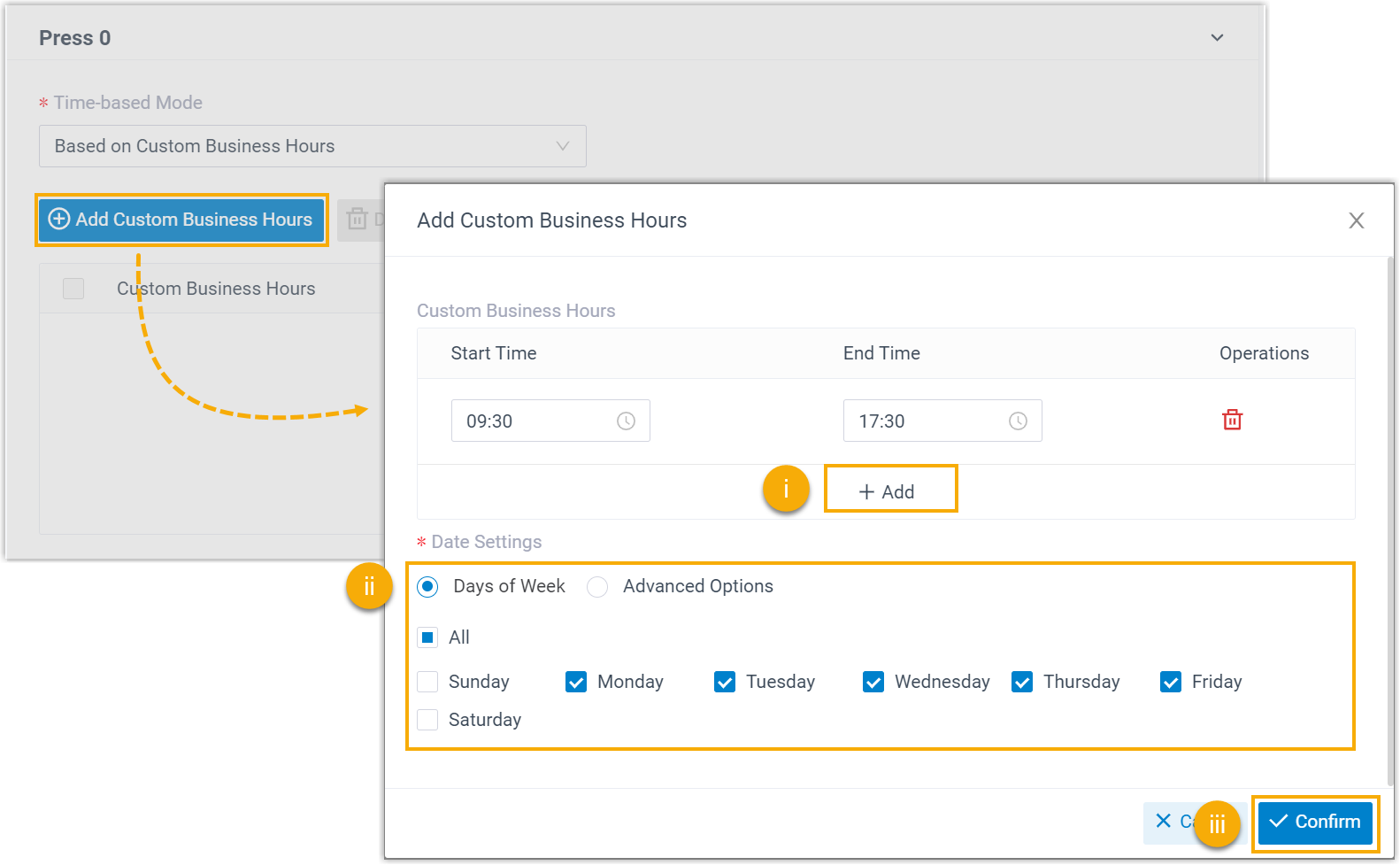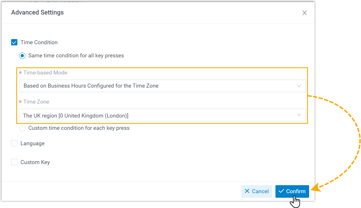 - Click Confirm to apply this custom business hours to all key press events in the IVR.