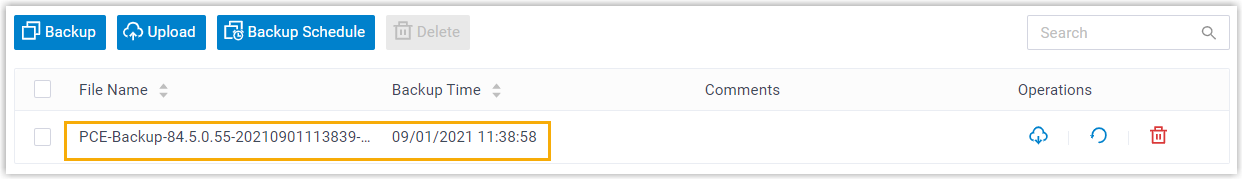 The system will back up the specified configuration data at the scheduled time. The automatic generated backup file will be displayed in the Backup and Restore list.