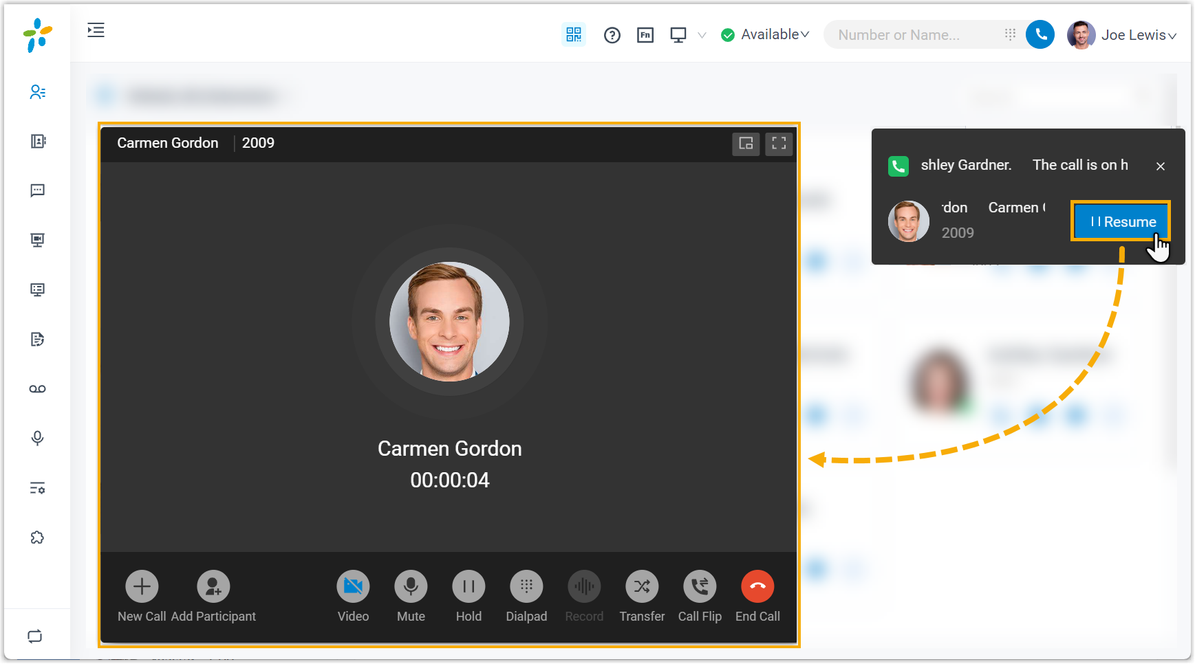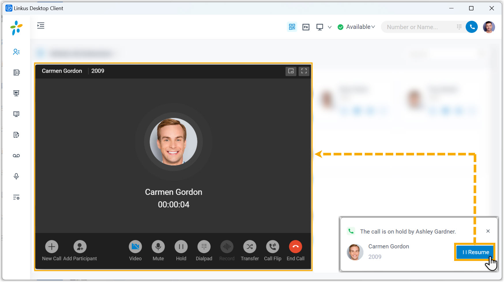 Endpoint Description Cloud Voice App Web Client & Cloud Voice App Desktop Client Click Resume in the pop-up window to answer the call.Note:- To use this feature, ensure the Cloud Voice App