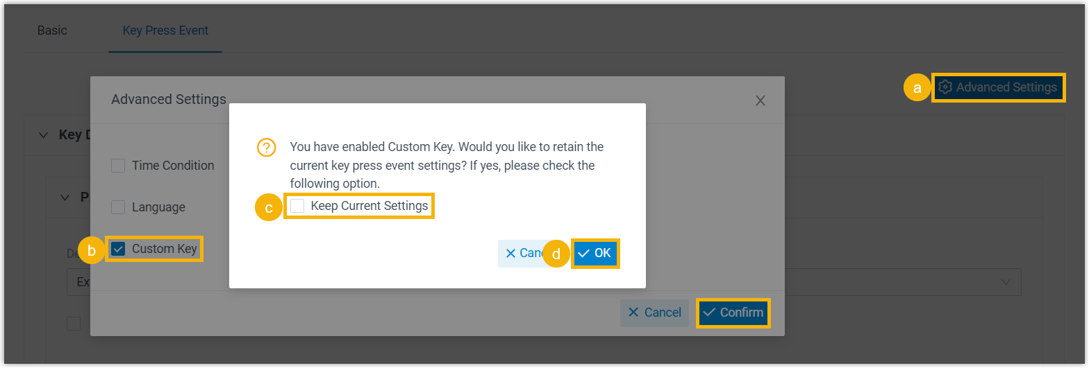 - Optional: Select the checkbox of Keep Current Settings to retain the current key press event settings.