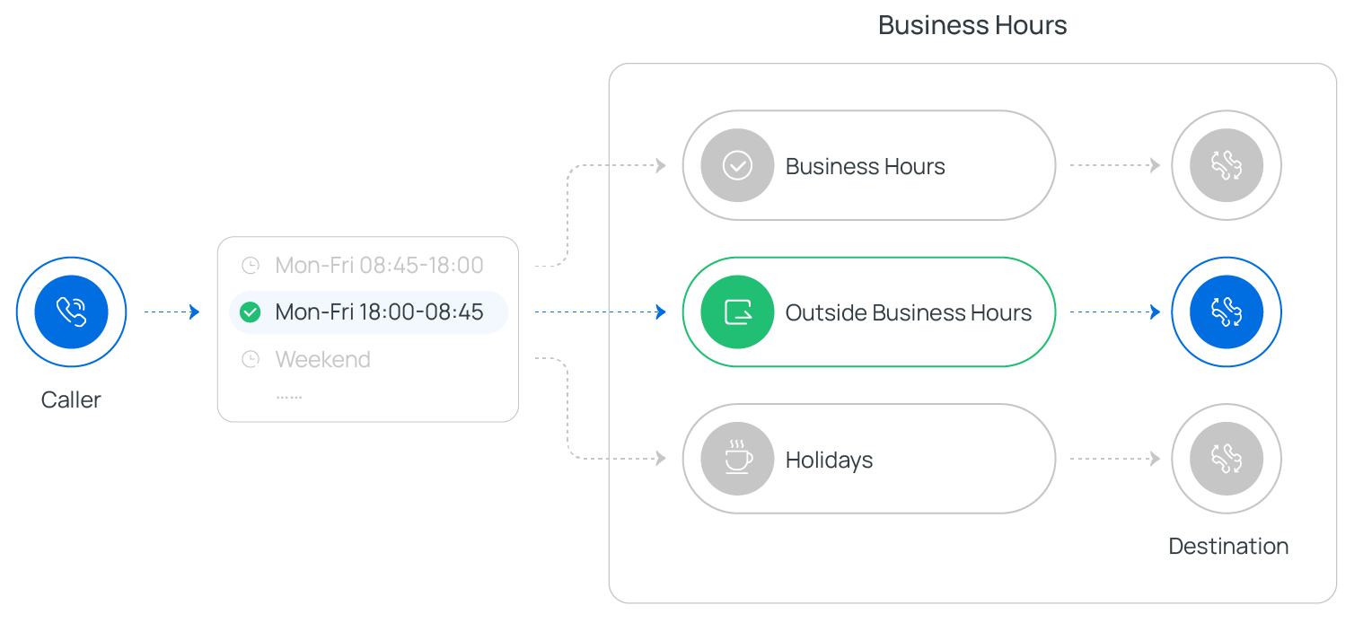Business Hours component allows you to route calls to different destinations based on the time of day. A variety of time-based modes are available to flexibly define office hours and implement time-based call routing.