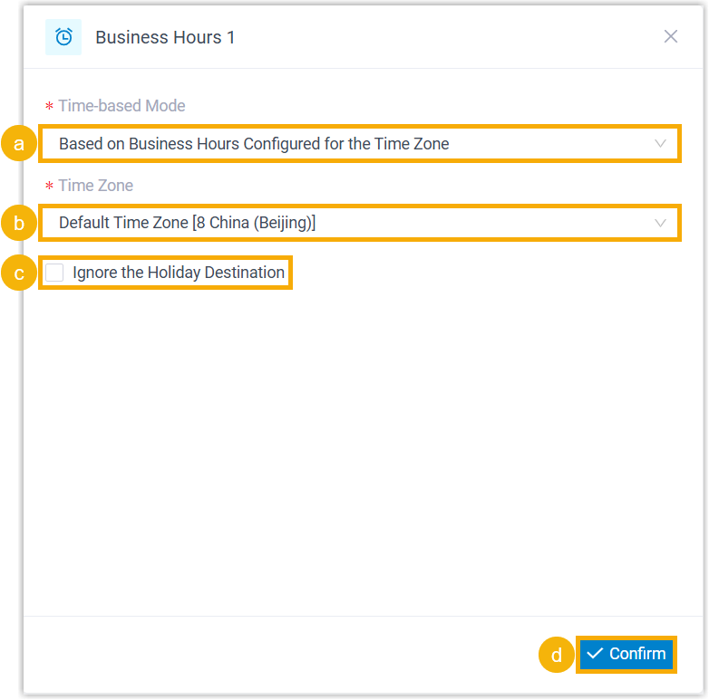 - In the Time-based Mode drop-down list, select Based on Custom Business Hours.