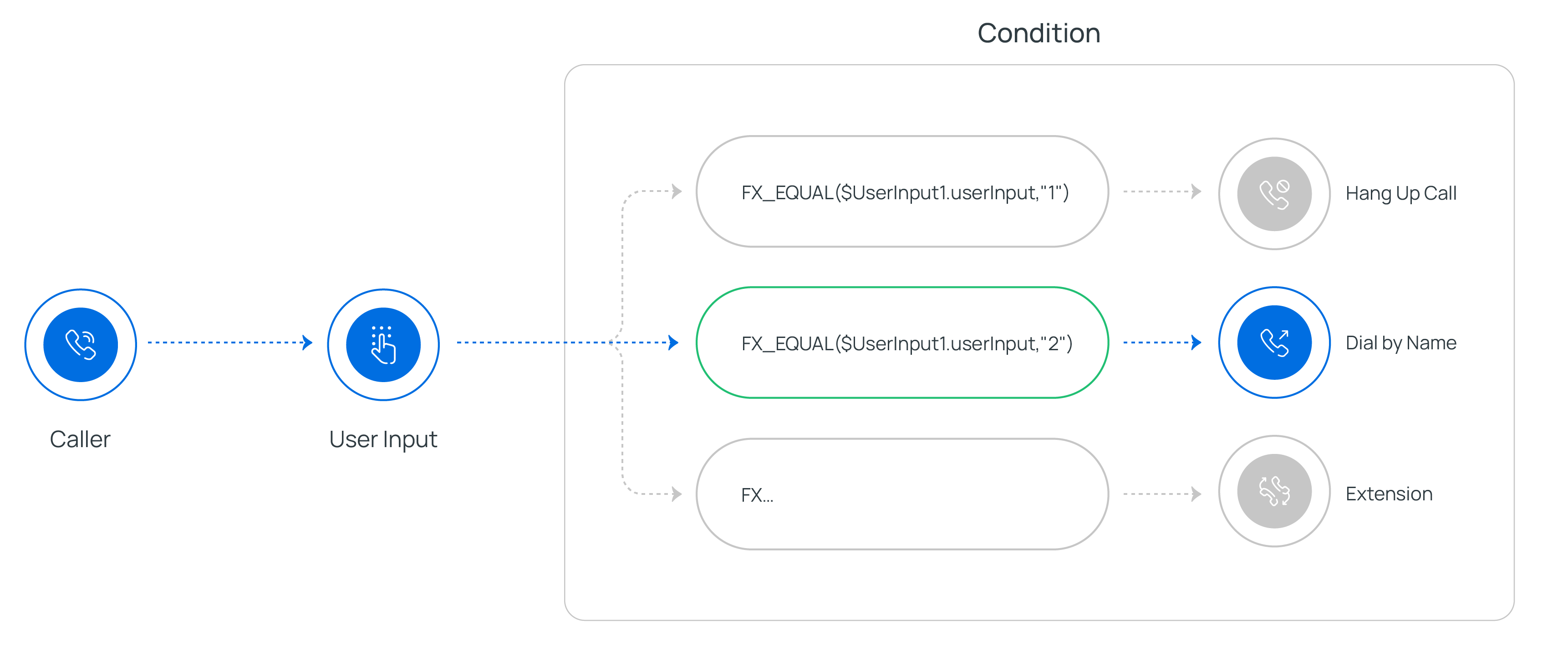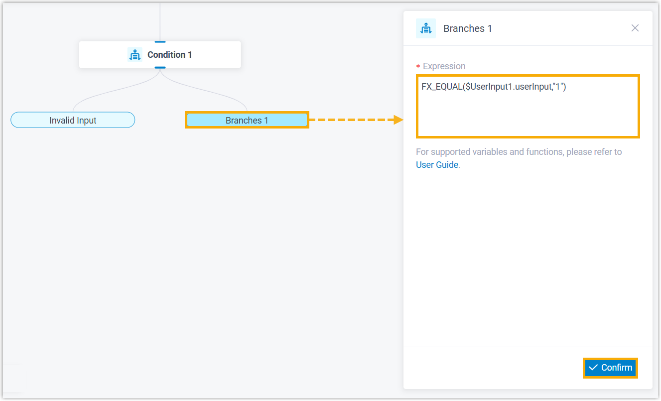 For example, enter FX_EQUAL($UserInput1.userInput,"1"). In this way, if the caller presses 1, the call will be routed to the component connected to the branch.