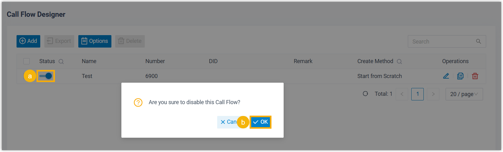- On the call flow list, turn off the switch of the desired call flow.