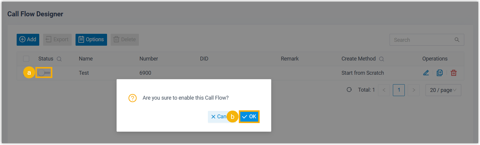 - On the call flow list, turn on the switch of the desired call flow.