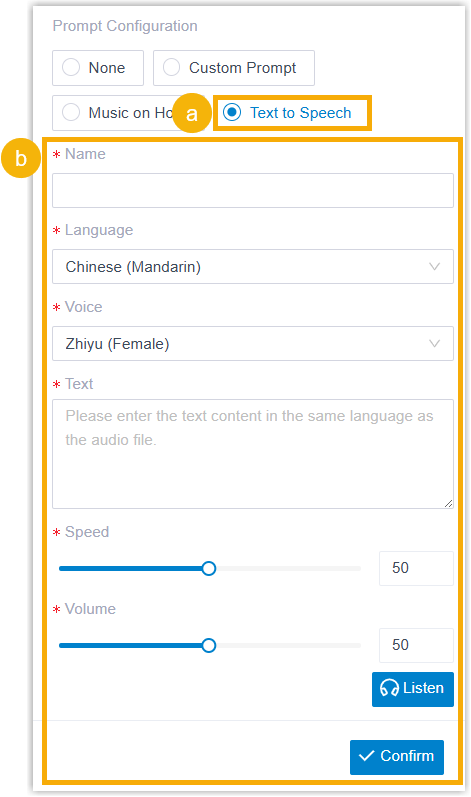 - Optional: Configure audio prompt(s) or a text-to-speech message to