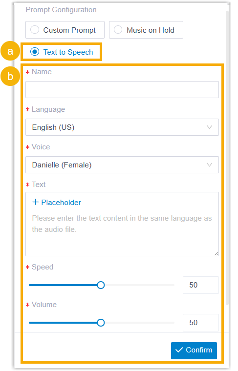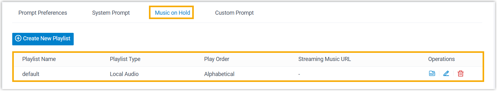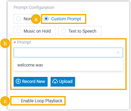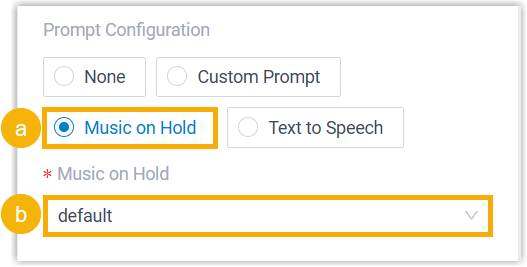 Prompt Type Description Custom Prompt Choose from existing custom prompts, or create a new one by recording with an extension or uploading an audio file. Music on Hold (MoH) Choose from existing MoH. Note: Before you begin, make sure the desired MoH is configured in PBX Settings > Voice Prompt > Music on Hold.