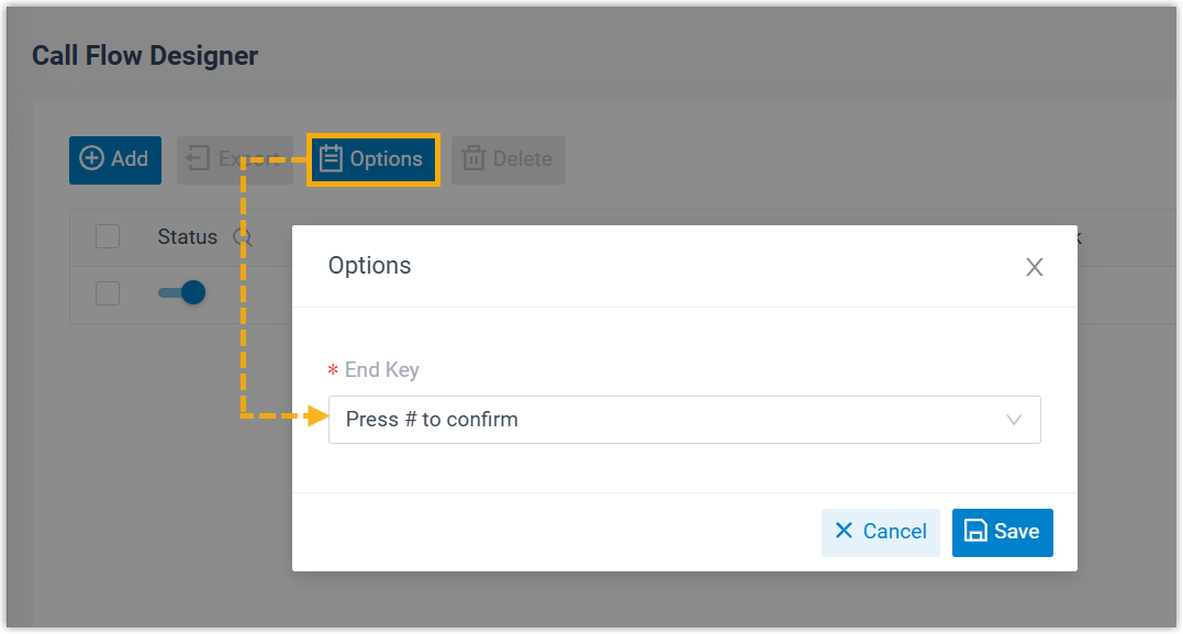 #key or*key.- You can set the end key in Call Flow Designer > Options.