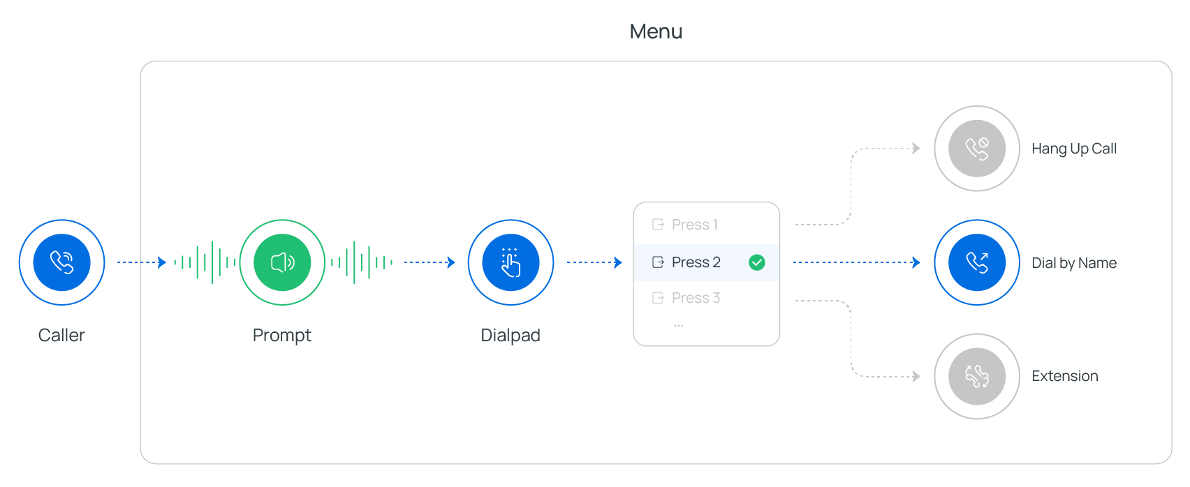 Menu component allows you to present callers with a set of menu options, and route calls based on the DTMF digit that they press. The input value is stored in variables, which can be used as input for subsequent components or for condition evaluation.