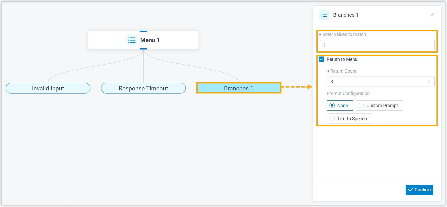 Return to Menu To allow callers to return to the component, proceed as follows. Note: This is helpful for replaying the prompt and allowing a retry when the caller fails to make a selection.- Select the checkbox of Return to Menu.