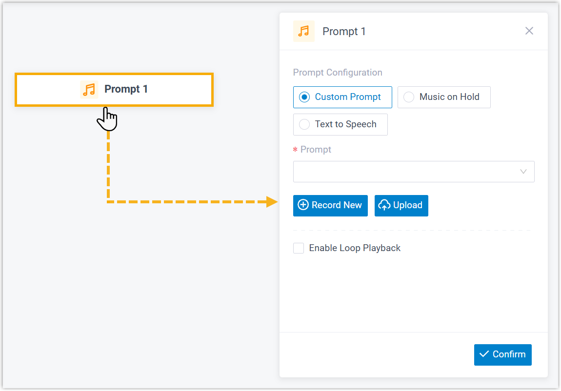 Prompt Type Description Custom Prompt Choose from existing custom prompts, or create a new one by recording with an extension or uploading an audio file. Music on Hold (MoH) Choose from existing MoH. Note: Before you begin, make sure the desired MoH is configured in .