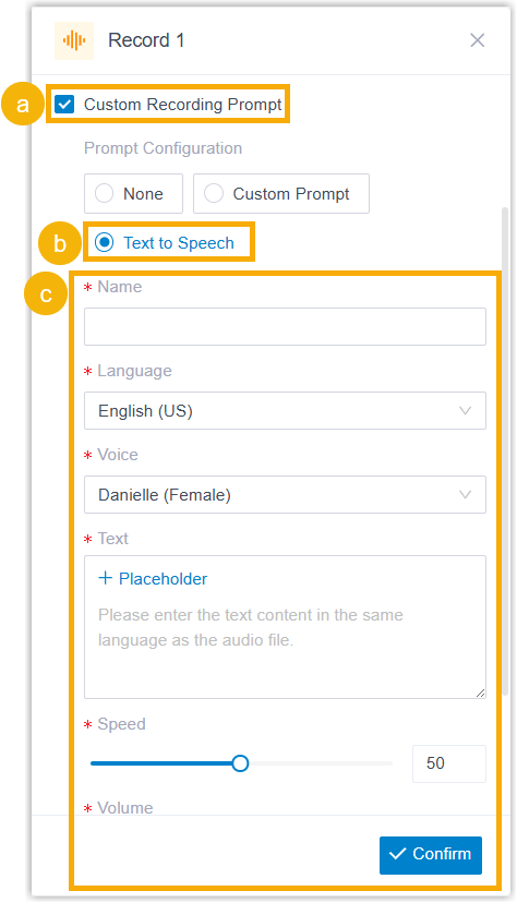 Prompt Type Description Custom Prompt Choose from existing custom prompts, or create a new one by recording with an extension or uploading an audio file. Text to Speech (TTS) Enter the desired text, which will be converted to speech in the selected language and voice style.