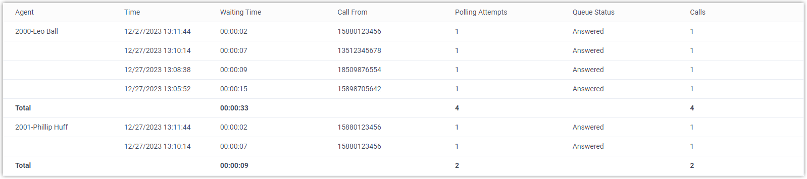 | Waiting Time | The amount of time that the caller waited before being answered or timeout. |