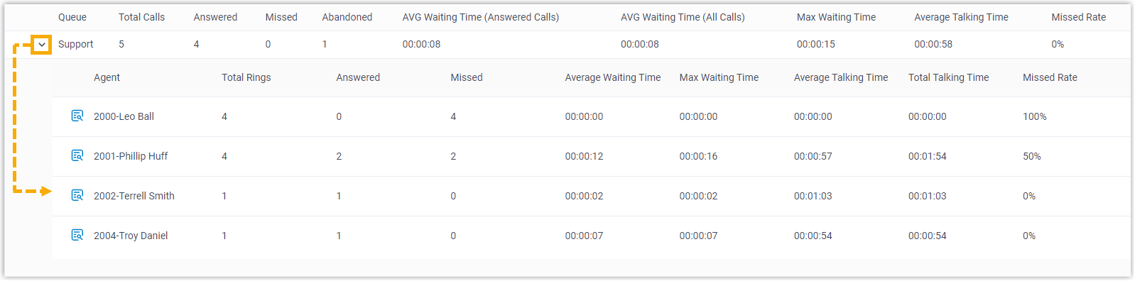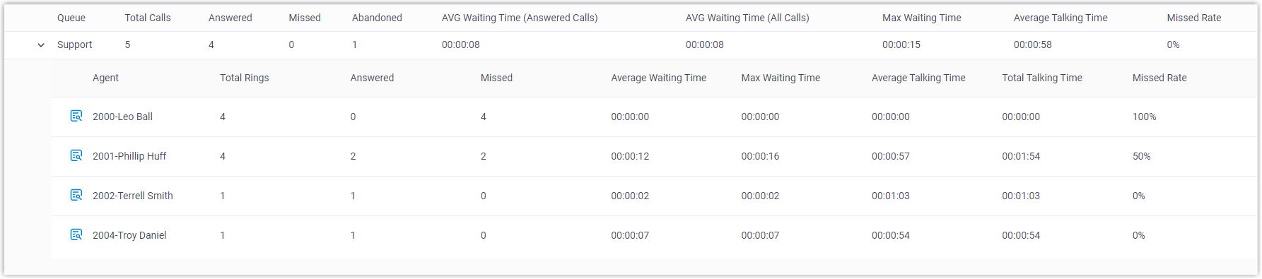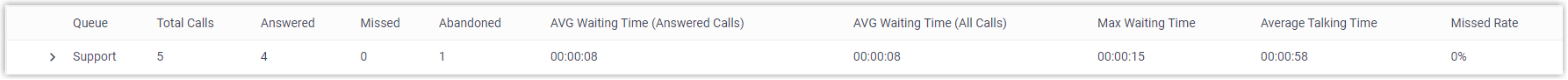 Answered The total number of calls that the agent answered. Missed The total number of calls that the agent missed. Note: If a call is distributed to an agent multiple times, the number of missed calls will be cumulated instead of counting only one missed call.Average Waiting Time The average amount of time that the answered calls had been waiting in the queue before being answered by the agent.