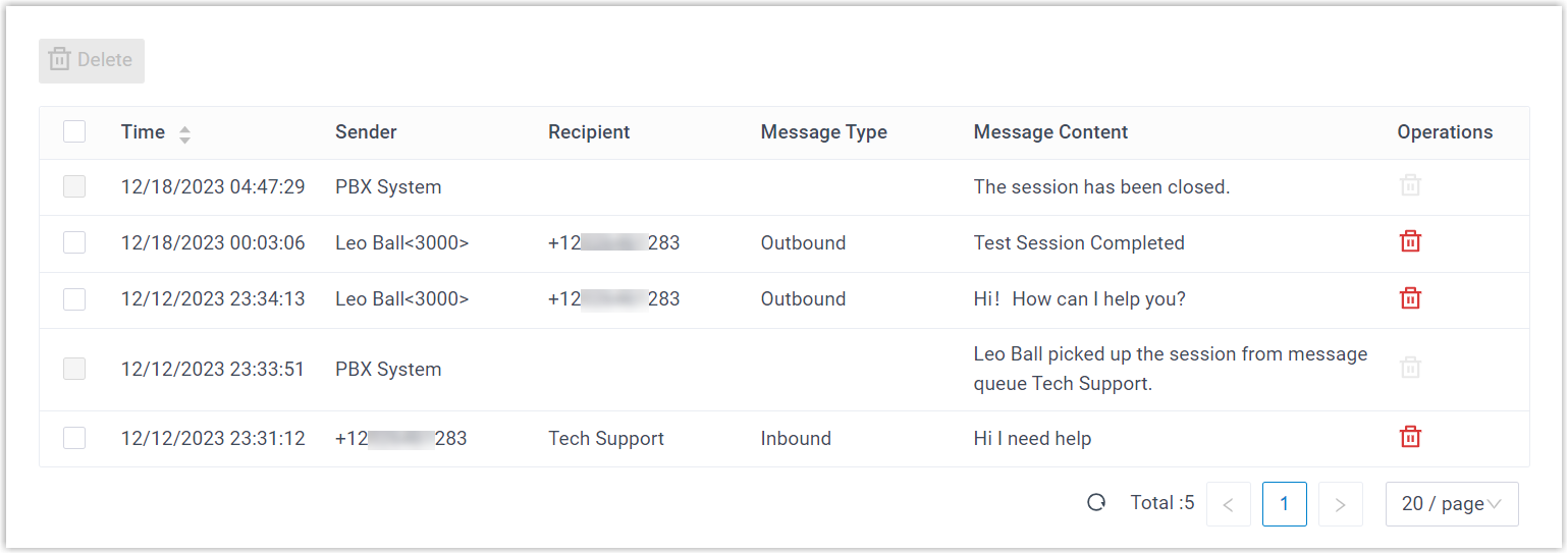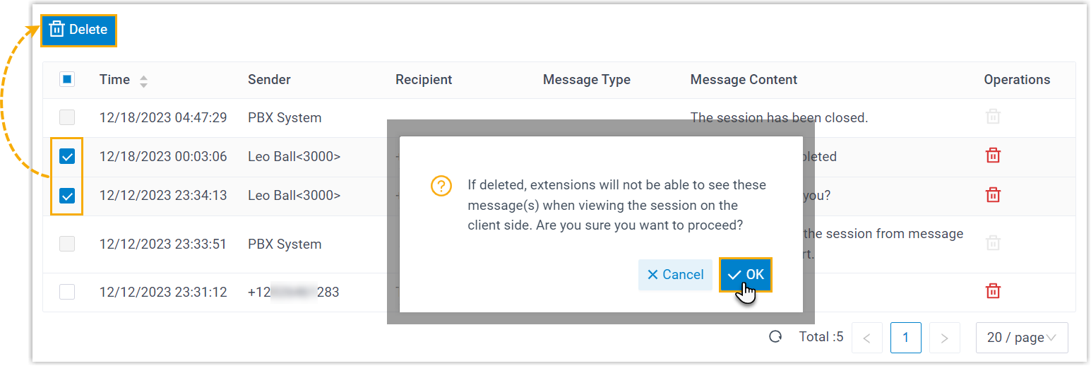 Delete chat histories of a session Note: Messages sent by the PBX system can NOT be deleted.- Click