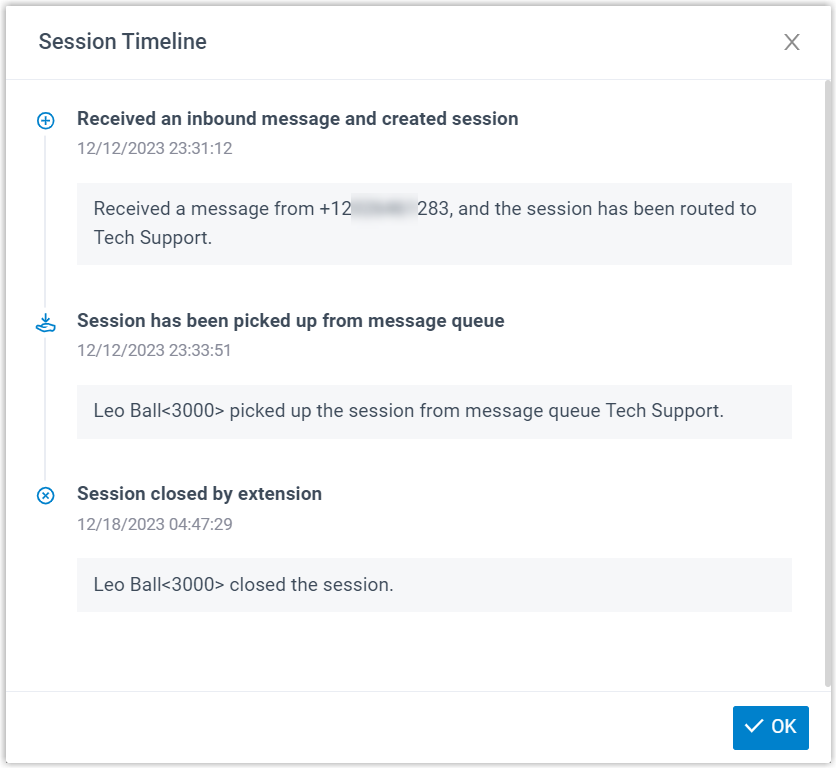A window pops up, displaying the operation records of the session in a timeline view.Note: Only the following operations will be recorded:- Create a session